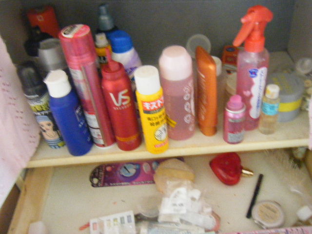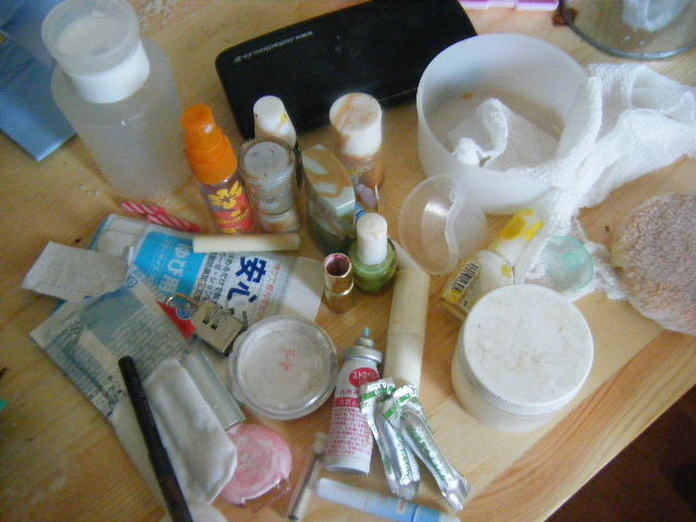 拾ったヘアワックスw、除光液容器、メガネケース(めがねは壊れて捨てました)、ほとんど残っていない&蓋がない口紅、半端な長さの包帯、キッタナイパフ、使いにくかったアイライナー、ウーを生んだ時に産院でもらった洗浄綿、ドロドロになった子ども用リップ、おしゃぶりの蓋だけ・・・・・
