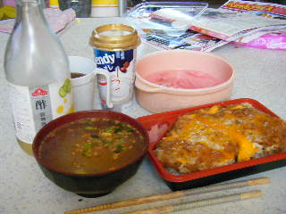 買ったかつ丼に春雨スープ。